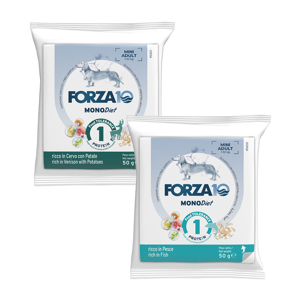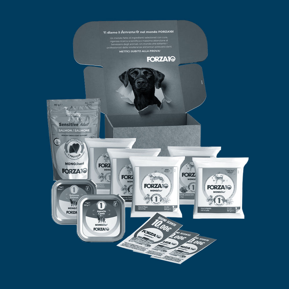 Il Kit Prova MONODiet è pensato per far conoscere al tuo cane la qualità delle ricette FORZA10. All’interno troverai una selezione di alimenti completi e bilanciati, studiati per garantire benessere e gusto in ogni boccone.